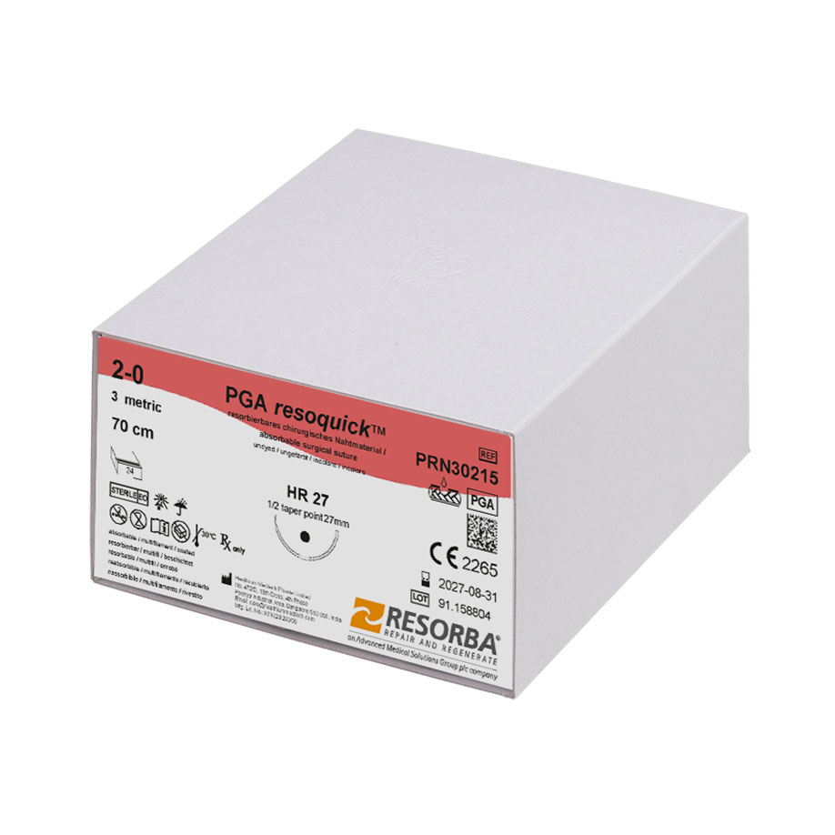 PGA RESOQUICK ist ein geflochtener Faden aus dem Polymer der Glykolsäure. Einzelfilamente von PGA RESOQUICK werden mit Durchmessern von 0,015 mm extruiert, in Bündeln gereckt und antikapillar geflochten. Es entsteht dabei ein angenehm weicher und flexibler geflochtener Faden. Die spezielle Resolacton-Beschichtung legt sich fein um die Faserbündel. Die lineare hochmolekulare Polyglykolsäure wird unter Einwirkung eines Katalysators synthetisiert. Die, im Vergleich zu PGA Resorba, beschleunigte Resorption wird durch ein modifiziertes Herstellungsverfahren erreicht. Der schnellere Abbau zu CO2 erfolgt bei PGA RESOQUICK im Gewebe durch Wasseraufnahme im Stoffwechsel. Die Fadenbeschichtung bewirkt sehr gute Handhabungseigenschaften und minimale Gewebetraumata durch gezielte Herabsetzung der Oberflächenreibung. Reißfestigkeit 50%": ca. 7 Tage Nadeltyp: 1/2-kreisförmig, Rundkörper-Nadel 27 mm."