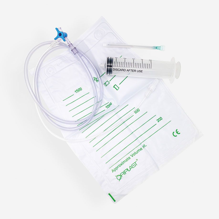 Pleurapunktions-Set zur Pleura- und Thoraxdrainage, geschlossenes System bestehend aus: Sekretauffangbeutel 1,5 Ltr., Schlauchlänge 90 cm, Rückschlagventil (RSV), Dreiwegehahn blau ohne Überwurfmutter, 2x Luer-Lock positiv Ansatz, Luer-Lock negativ Ansatz, Schutzkappe, Schraubkappe, Punktionskanüle 14 G, Ø 2 mm, Stichlänge 75 mm, 50 ml Einmal-Spritze Luer-Lock, latexfrei