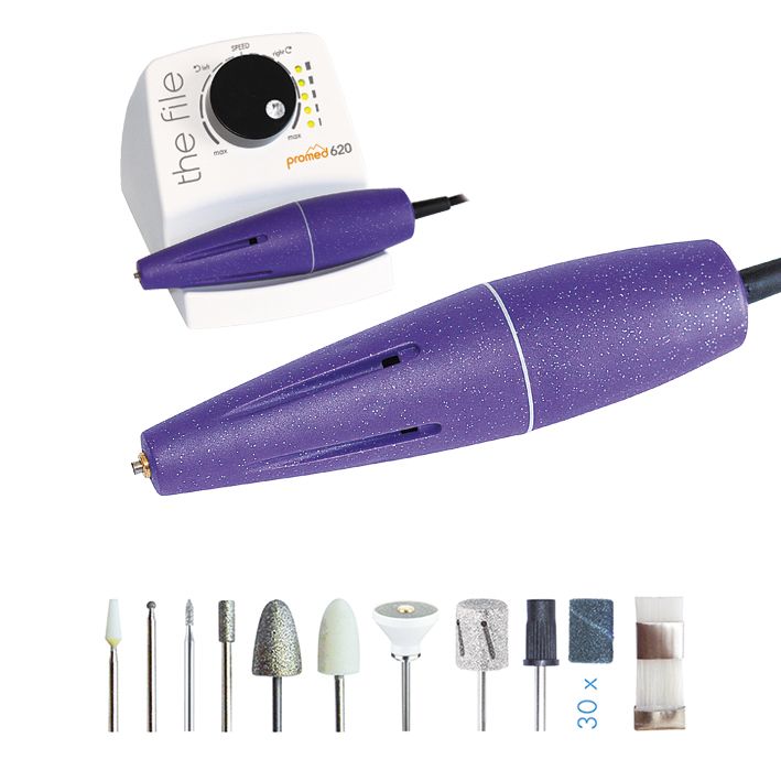 Das ideale Einsteigergerät (schnell und durchzugsstark) für Arbeiten in der Mani- und Pediküre. Aufgrund der kleinen Ausmaße bestens auch geeignet als Zweitgerät oder für Hausbesuche. All in One Regler (20.000 U/min Rechts/Linkslauf, On/Off), veredelt mit SWAROVSKI ELEMENTS und Safety-Stop (wird mit zu hoher Drehzahl und zu viel Druck beim Schleifen gearbeitet, registriert dies die Elektronik und schaltet das Gerät ab). Automatische Schnellspannzange für handelsübliche Standardbits (Schaft Durchmesser 2,32-2,35 mm), 75 g leichtes Handstück, Auflage für das Handstück am Gerät, Geschwindigkeitsanzeige mittels 5-LED Leuchten, inkl. 40 Zubehörteile, Handtuch, Bithalter und Feile 620. Spannungsversorgung: 100 - 240 V, 50 Hz/60 Hz, 21 Watt. Made in Germany.