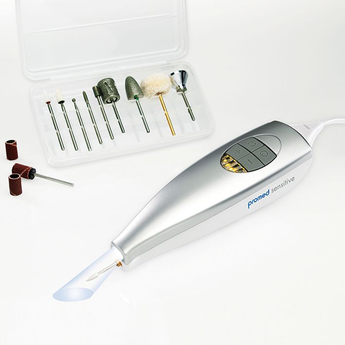 Die Extraklasse mit Kaltlichtstrahler, im hell beleuchteten Arbeitsbereich pflegen Sie Ihre Natur- und Kunstnägel noch präziser, entfernen Sie Ihre Hornhaut noch genauer, alle Mani- und Pedikürarbeiten werden schnell und mühelos erledigt. Komfortable, staubgeschützte Softtouch-Bedientasten regeln Rechts/Linkslauf und durchzugsstarke Schleifkraft bis zu 12.000 U/min. Intensitätsanzeige über 5 LEDs. Im praktischen Aufbewahrungsetui. Inkl. 42-teiligem Zubehör. Spannungsversorgung: Power Sicherheitstransformator 100-240 V, 50/60 Hz, 450mA, Sek. 14 VDC, 800mA