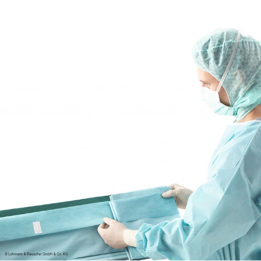 - flüssigkeitsundurchlässige, gut drapierfähige, selbstklebende Abdeckung zur einfachen und sicheren Applikation am Patienten und Abgrenzung des OP-Feldes