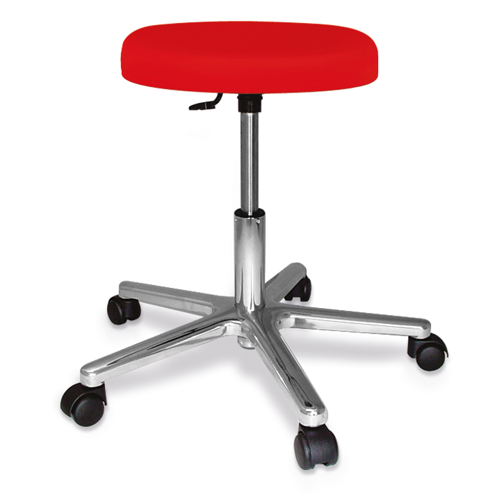 Fußkreuz: Ø 60 cm, Polsterhöhe 70 mm, keine Nähte für eine leichte Desinfektion, Sitzfläche Ø 38,5 cm, höhenverstellbar von 45 - 59 cm, Höhenverstellung durch Gasdruckfeder, harte Rollen für weiche Böden, max. Tragkraft 135 kg