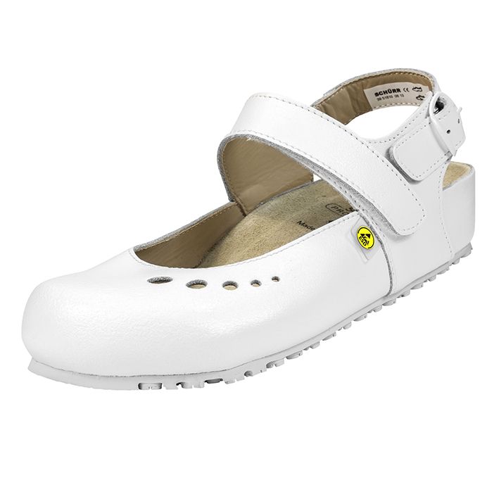 Tiefbettsandale mit anatomisch geformten Fußbett aus Kork, mit Lederauflage und Fersendämpfung. Die Spezialsohle A4 aus Nitril-Kautschuk ist extrem rutschhemmend und ESD-tauglich.
