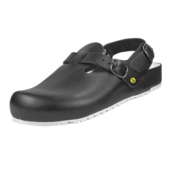 Tiefbettsandale mit anatomisch geformtem Fußbetten aus Kork, mit Lederauflage und Fersendämpfung. Die Spezialsohle A4 aus Nitril-Kautschuk ist extrem rutschhemmend und ESD-tauglich.