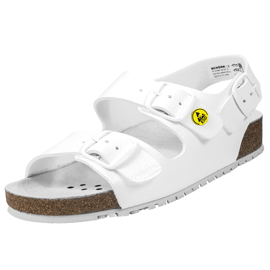 Tiefbettsandale mit anatomisch geformten Fußbett aus Kork, mit Lederauflage und Fersendämpfung. Die Spezialsohle A4 aus Nitril-Kautschuk ist extrem rutschhemmend und ESD-tauglich.