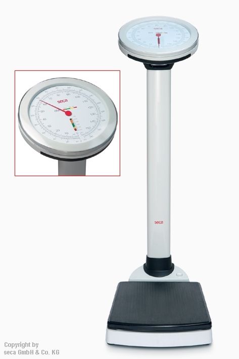 Als eine der ersten mechanischen Säulenwaagen ermöglicht die seca 755 neben der Gewichtsanzeige zusätzlich die Ermittlung des jeweiligen Ernährungszustands durch den BMI. Dabei setzt sich beim Betreten der Waage in der großen Kreisanzeige, unterhalb der sehr präzisen Gewichtsanzeige, eine farblich unterteilte BMI-Scheibe" in Bewegung. Sichtbar ist sie in einem kleinen Fenster, neben dem eine Größen-Skala aufgedruckt ist. Ist das Gewicht ermittelt, lässt sich anhand dieser Skala bequem der BMI-Bereich ablesen, der farblich in Unter-, Normal- und Übergewicht sowie Adipositas (krankhaftes Übergewicht) aufgeteilt ist. Eine flache Trittfläche sowie praktische Transportrollen sind weitere Vorteile der seca 755.