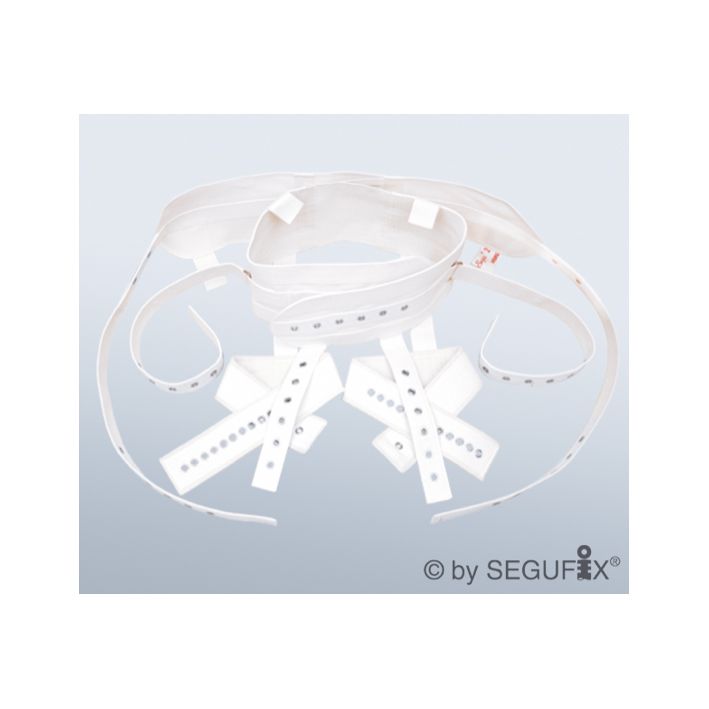 Fixierung von Patienten und Lagerungshilfe auf dem Bett. Zur Anwendung von freiheitsentziehenden Maßnahmen. Bestehend aus: 1 SEGUFIX®-Standard mit Oberschenkelmanschetten und Seitenbefestigungen integriert. Spannweite des Bettgurtes: 145 - 170 cm (Ösengurt), ohne Schloss und Schlüssel, Umfang Taille: 80 - 120 cm, Umfang Oberschenkel: 50 - 72 cm, Bauchgurt: 18 cm, Bettgurt: 18 cm.