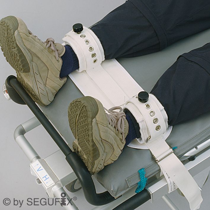 Fixierung eines oder beider Füße auf Tragen und Liegen. Auch für den Rettungsdienstbereich geeignet. Zur Anwendung freiheitsentziehender Maßnahmen. Tragenbreite: ca. 40 - 80 cm. Bestehend aus: 1 SEGUFIX®-Tragengurt-Fuß (für beide Füße), 2 SEGUFIX®-Schlösser (SEGUFIX®-Schlüssel separat bestellen). Umfang Fußgelenk: 27 - 33 cm.