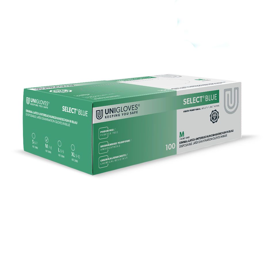 UNIGLOVES SELECT® BLUE Premium Latexhandschuhe sind vielseitig verwendbare, lebensmittelechte Hygiene- und Schutzhandschuhe aus hochwertigem Naturlatex. Neben unterschiedlichen Einsatzbereichen in der Gastronomie, Industrie und Reinigung kommen die Einweghandschuhe auch in Krankenhäusern und Arztpraxen zum Einsatz. Geprüft wurde das Produkt nach der PSA-Verordnung (EU) 2016/425 sowie den europäischen Normen EN 374, EN 420 und EN 455. Das wasserdichte Material zeichnet sich durch hohe Strapazierfähigkeit aus und bietet Schutz gegen Viren, Pilze und Bakterien. Die mikroraue Oberfläche der Handschuhe sorgt für extra Halt und Sicherheit im Umgang mit Instrumenten oder feuchten Gegenständen. Mit einem Proteingehalt von weniger als 50 µg/dm² ist das Latex auch für empfindliche Haut überaus angenehm. Das An- und Ausziehen gestaltet sich dank der Chlorinierung und dem stabilen Rollrand äußerst schnell und einfach. Zudem eignen sich das beidhändige Design und die flexible Passform hervorragend für den häufig wechselnden Gebrauch.