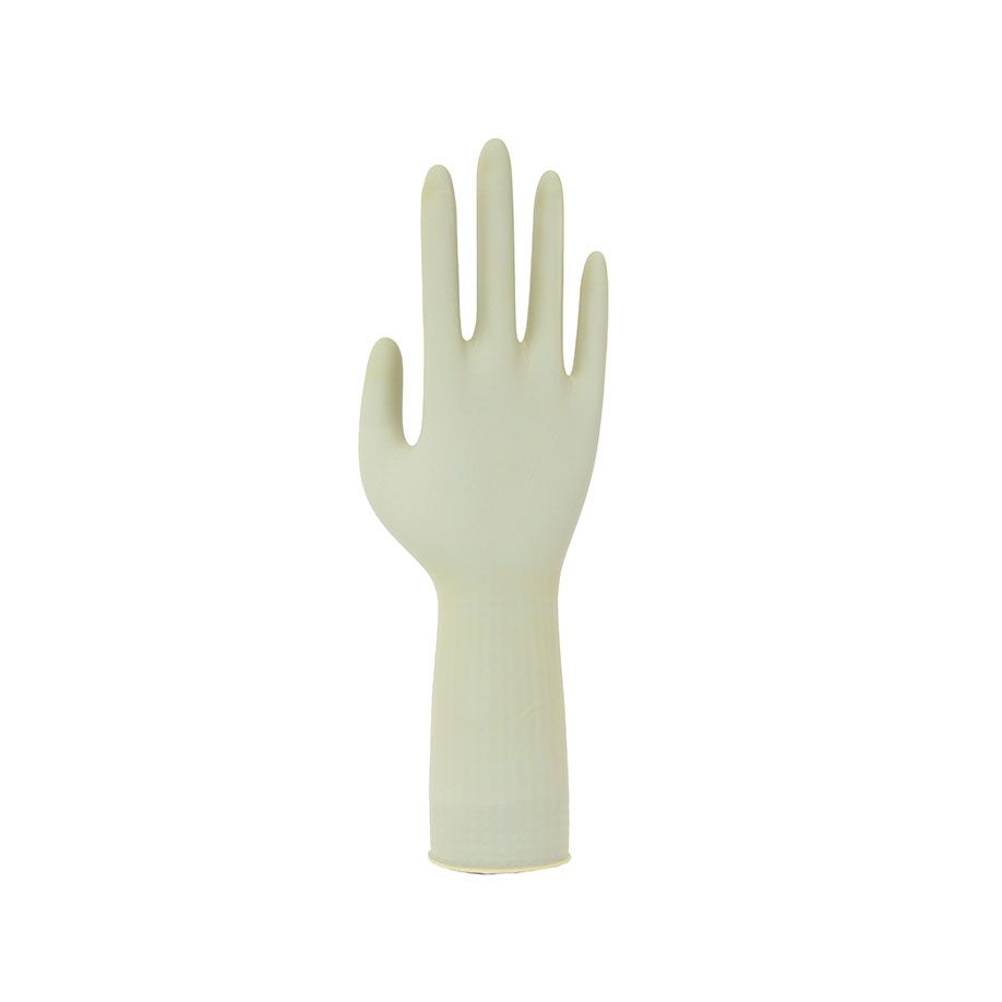 - konisches Stulpendesign mit Rollrand, damit der Handschuh am OP-Mantel haftet und um zu verhindern, dass die Stulpe während der Verwendung herabrutscht