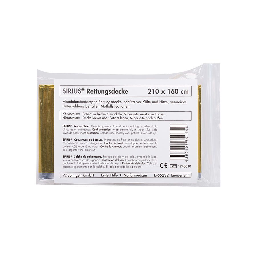 Im Hochvakuum aluminiumbedampfte Spezialfolie, reflektiert bis zu 85 % der Körperwärme, kann Abstrahlungsverlust vermeiden, Auskühlung und Unterkühlung verhindern, auch als Hitzeschutz verwendbar. Vorgeschrieben für Betriebsverbandkasten nach DIN 13157 und DIN 13169 sowie Kfz.-Verbandkasten nach DIN 13164. Die Rettungsdecke sollte auch in keiner anderen Erste-Hilfe-Ausrüstung fehlen, in Cellophan.