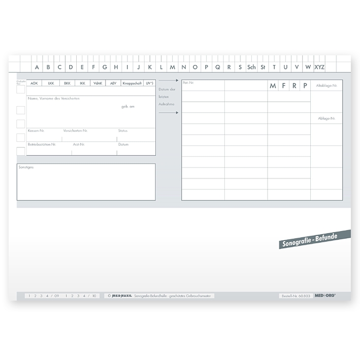 zur dauerhaften Aufbewahrung von Sonograf eaufnahmen durch Lichtschutz-innenbeschichtung, tasche im Format 212 mm x 152 mm, weiß, vorderseitig bedruckt zur Befundaufnahme, längsseitige Verschlußlasche (MeD aUxiL Nr. MU 1250)