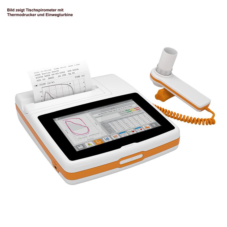Spirolab® ist ein Tischspirometer mit einem 7 Zoll großen Farb-Touchscreen-Display (Auflösung von 800 x 480 Pixel) und integriertem Drucker. Es kann als Stand-Alone-Gerät (ohne Verwendung von einem PC) oder als PC-basiertes Spirometer verwendet werden. Die Daten können kabellos per Bluetooth® oder per USB-Kabel an den PC übertragen werden.