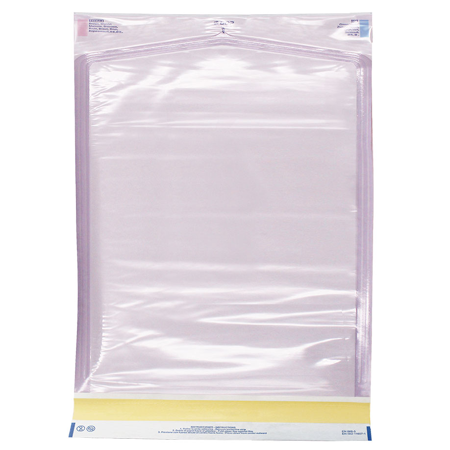 Selbstklebende Klarsichtbeutel mit manuell verschließbarem Selbstklebestreifen (Breite 19 mm) Eingriffsöffnung für leichteres Öffnen durch peelen. Mit Dampf- und EO-Gas-Indikator.