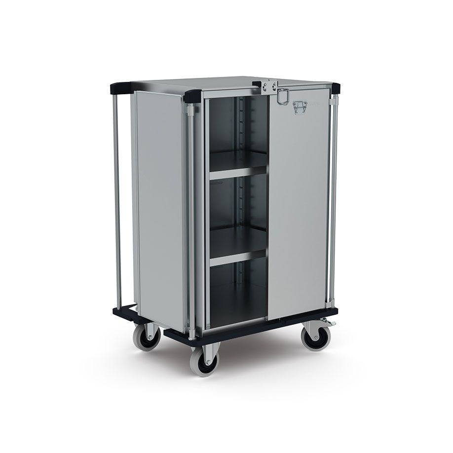 Edelstahl Transportwagen für Transport und Lagerung von Sterilgütern in Containern oder Körben. Edelstahlrolle 160 mm im Standard. Inklusive Schildhalter. Wagen komplett aus hochwertigem Edelstahl, stabile, selbsttragende und hygienische Konstruktion. Einwandiger, allseitig geschlossener Wagenkorpus in vollverschweißter, waschanlagentauglicher Ausführung. Aussteifung des Wagendaches durch Kreuzschlag nach oben. Doppelwandige Flügeltüren mit umlaufenden Dichtungen um 270° zu öffnen, automatische Verschlussmechanik, mit einer Hand bedienbar. Türverschluss durch integrierte 2-Punkt-Verriegelung. Innenraum mit herausnehmbaren und auf der kompletten Innenraumhöhe höhenverstellbaren, geschlossenen Auflagen. Vier senkrecht durchgehende Schubstangen (2 je Seite) zum Manövrieren auch bei geöffneten Türen. Anfahrschutz durch stabile umlaufende Stoßleiste mit stirnseitigen Aussparungen für eventuelle Zugvorrichtung am Fahrwerk, auch bei geöffneten Türen wirksam. Wagen fahrbar auf 2 Lenkrollen mit Totalfeststeller, 2 Bockrollen, mit mehrfach verschraubten Anschraubplatten befestigt.
