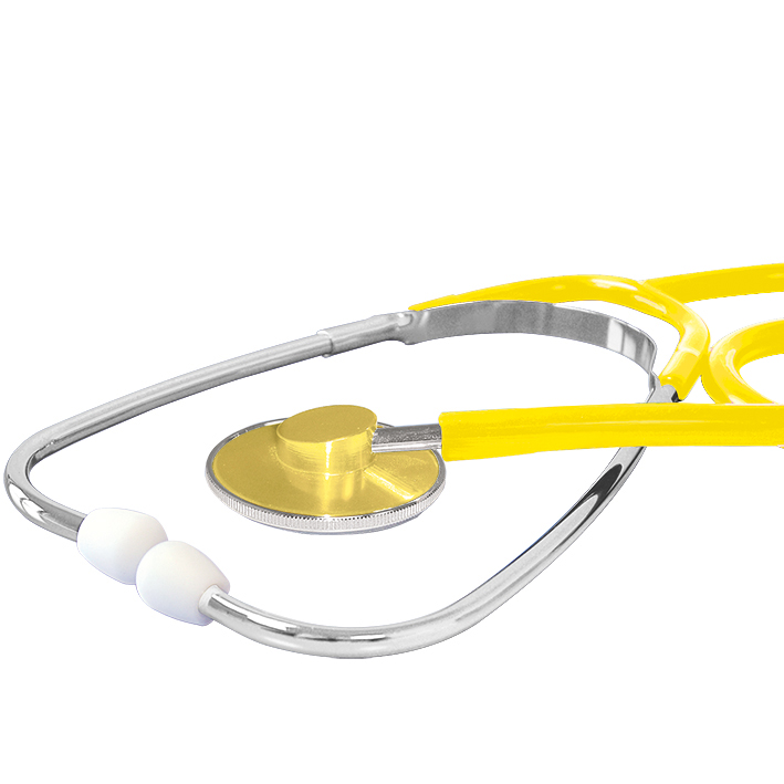 ausgezeichnete Akustik durch ultraleichtes Aluminium-Bruststück, außen liegende Ohrbügelfeder, mit weißen, harten Schraub-Ohroliven, 100% latexfrei und nickelfrei, Flachmembrane: 43 mm Ø, Gesamtlänge: 80 cm, Gewicht: ca. 77 g