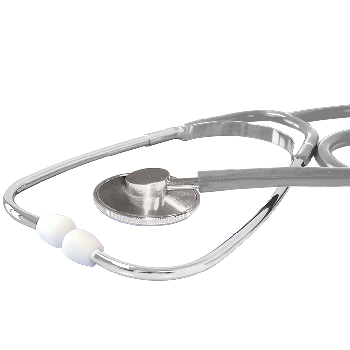 ausgezeichnete Akustik durch ultraleichtes Aluminium-Bruststück, außen liegende Ohrbügelfeder, mit weißen, harten Schraub-Ohroliven, 100% latexfrei und nickelfrei, Flachmembrane: 43 mm Ø, Gesamtlänge: 80 cm, Gewicht: ca. 77 g