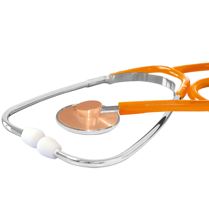 ausgezeichnete Akustik durch ultraleichtes Aluminium-Bruststück, außen liegende Ohrbügelfeder, mit weißen, harten Schraub-Ohroliven, 100% latexfrei und nickelfrei, Flachmembrane: 43 mm Ø, Gesamtlänge: 80 cm, Gewicht: ca. 77 g