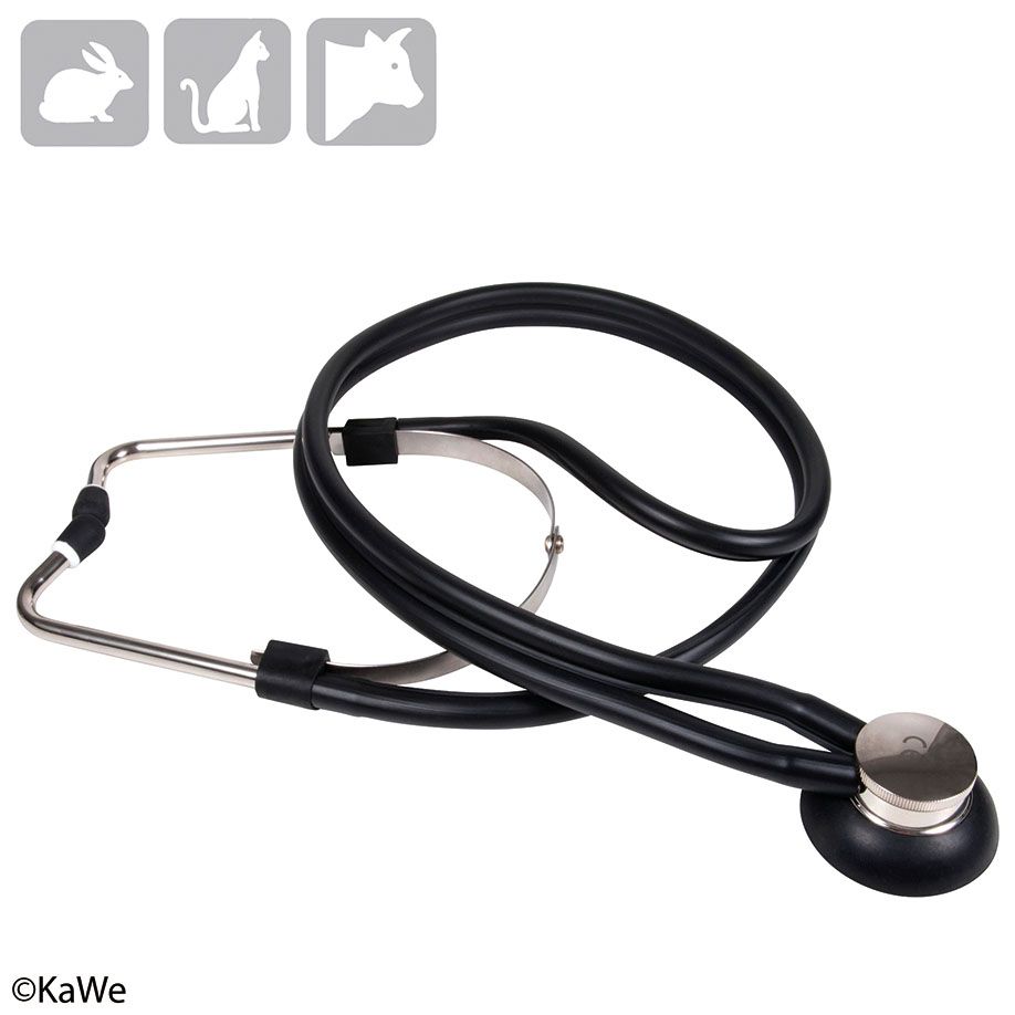 Trichter-Stethoskop. Speziell für den Einsatz in der Veterinärmedizin entwickelt, mit drehbaren Ohroliven und zusammenlegbarem Ohrbügel, Schlauchlänge ca. 75 cm, Trichter Ø 49,5 mm, Gesamtlänge ca. 88 cm, Gewicht: ca. 240 g