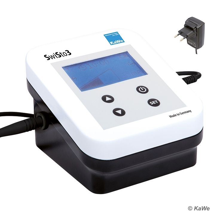 SwiSto3 Gleich- und Pulsstromtherapie mit nur einem Gerät für die Hand-, Fuß- und Achselschweißbehandlung. Das SwiSto3 in modernem Design ist äußerst benutzerfreundlich und bietet für die Behandlung der Hyperhidrosis zwei Möglichkeiten: Therapie mit Gleichstrom oder Therapie mit Pulsstrom, der besonders für empfindliche Patienten oder Kinder und Jugendliche geeignet ist. Das SwiSto3 ist ohne Sprachsoftware. Der Benutzer wird einfach durch das Menü geführt und muss die gewünschte Einstellung nur noch mit der SET-Taste bestätigen. Das Grafik-LCDModul ist beleuchtet und bietet eine übersichtliche und deutliche Ansicht aller Einstellungen. Der Anwender kann während der Behandlung die Stromstärke selbst verändern, so dass eine zweite Person sowie ein Fußschalter nicht notwendig sind. Die automatische Stromregulierung hat den Vorteil, dass der Nutzer dieses Gerätes kein Stromschlagempfinden (Weidezauneffekt) bei Herausnahme der Hände und Füße während der Behandlung verspürt. Das SwiSto3 ist mit einer Abschaltautomatik ausgestattet. Bei Nichtausschalten des Gerätes nach der erfolgten Behandlung schaltet sich dieses selbstständig nach 2 Minuten ab. Lieferumfang: Iontophoresegerät, Ladestecker. Abmessungen: B 110 x H 84 x L 120 mm, Gewicht: Iontophoresegerät, allein, ca. 0,36 kg