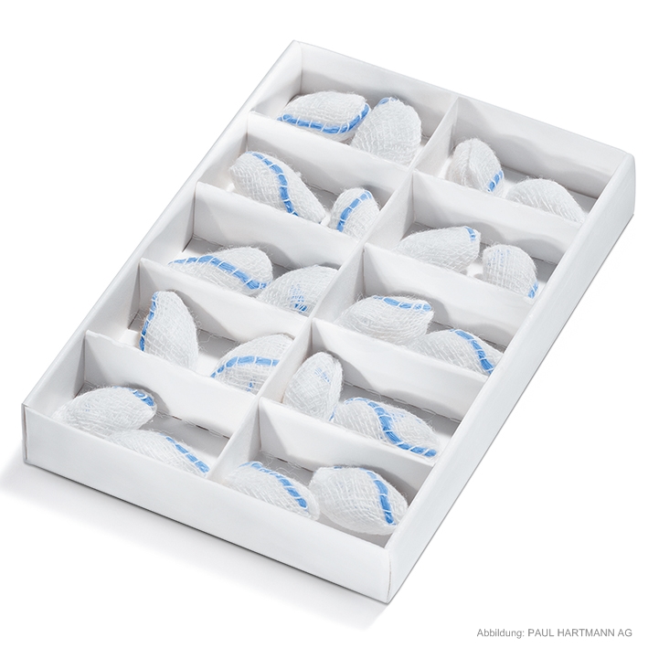 Präpariertupfer aus Verbandmull EN 14079, 24fädig, einteilig, fest gedreht, mit eingewebtem Telatrast Röntgenkontrastfaden, unsteril