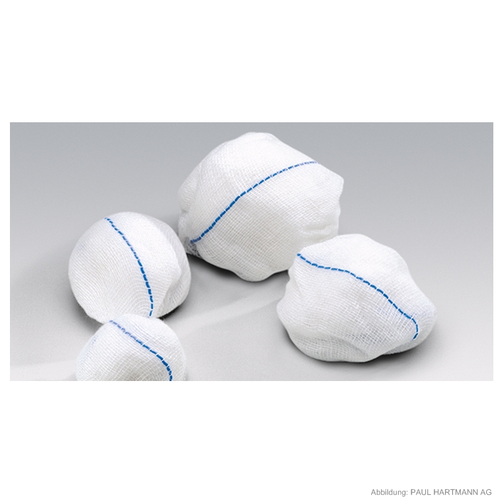 Schlinggazetupfer mit eingewebtem Telatrast® Röntgenkontrastfaden sind aus nur einem Mullstück handgedreht. Das verleiht ihnen eine höhere Festigkeit, was speziell bei der Blutstillung und Handhabung von Vorteil ist.