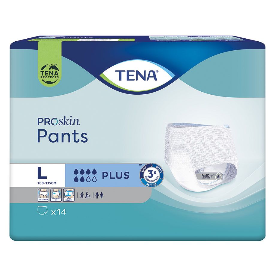 TENA ProSkin Pants Plus sind weiche und bequeme Einweghosen für Tag und Nacht, die es für Männer und Frauen gibt. Anders als Standard-Einweghosen verfügen die TENA ProSkin Pants über eine spezielle Technologie zur Feuchtigkeitsreduktion. Sie halten trocken und bieten Schutz vor Auslaufen und Geruchsbildung. FeelDry Advanced zieht Flüssigkeit sofort von der Oberfläche weg, der Absorptionskern schließt die Flüssigkeit schnell ein (auch in größeren Mengen), hält die Haut trocken und sorgt für den Erhalt der Hautgesundheit. Diese Einweghosen bestehen aus textilähnlichem, atmungsaktivem Material mit außerordentlich hoher Absorptionskraft und bequemer Passform, genauso wie bei herkömmlicher Unterwäsche.