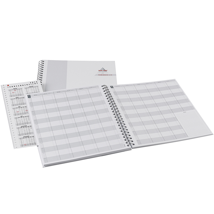 2 Spalten pro Tag, 15-Minuten-Takt, Ringbuch, neutral für 52 Wochen, Montag bis Samstag, je Woche ½ Notizenspalte, 10 Notizenseiten, Telefonregister A-Z, Buch geschlossen 27 x 30 cm, offen 53 x 30 cm (B x H)