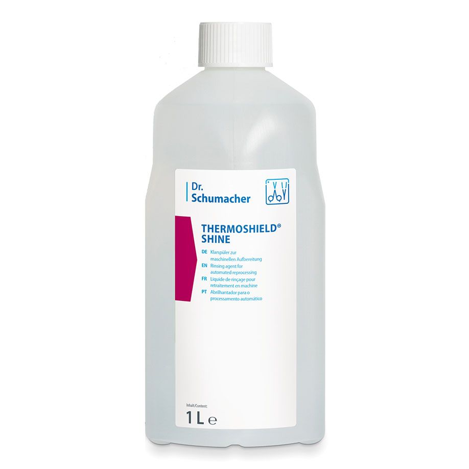 THERMOSHIELD® SHINE ist ein flüssiges Konzentrat zum Einsatz als Klarspüler in RDGs und Thermodesinfektoren zur Aufbereitung von medizinischen und dentalmedizinischen Instrumenten sowie Medizinprodukten. Es verhindert durch seinen sauren pH-Wert die Bildung von Belag an den Instrumenten und in der Maschine. Durch das schnelle Trocknungsverhalten wird die Bildung von Wasserflecken vermieden und eine Zeitersparnis im Aufbereitungsprozess erzielt.