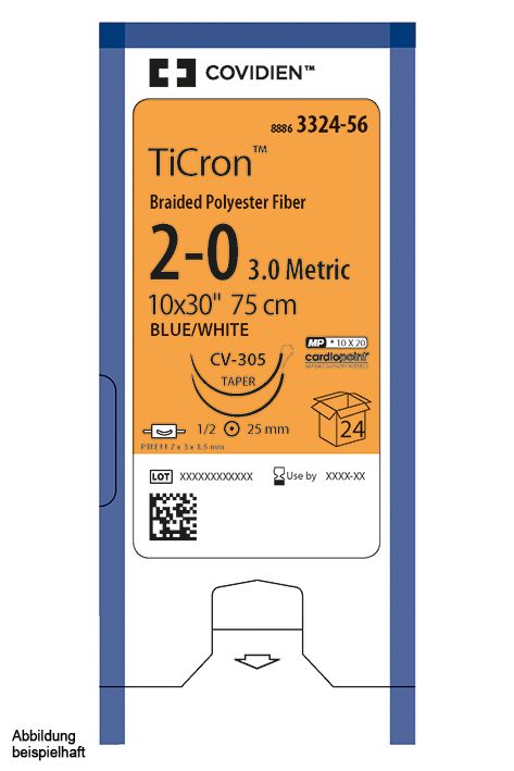 Das Ti-Cron Nahtmaterial aus Polyester ist ein nicht resorbierbares, steriles, chirurgisches Nahtmaterial aus Polyethylenterephthalat. Dieses geflochtene Nahtmaterial ist mit einer gleichmäßigen Silikonbeschichtung, welche die Oberflächengleitfähigkeit erhöht und die Handhabungseigenschaften, die Gewebedurchzugsfähigkeit sowie den Knotenlauf verbessert. Zur allgemeinen Approximation und/oder Ligatur von Weichgewebe, darunter auch bei kardiovaskulären, ophthalmologischen und Nervengewebe, indiziert.