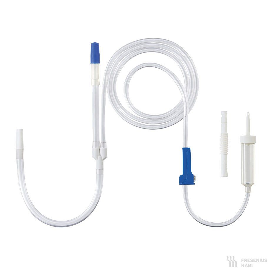 Überleitgerät mit Dorn-Anschluss für das intra- und postoperative Überleiten von Spüllösungen aus Behältnissen mit Stopfenanschluss.