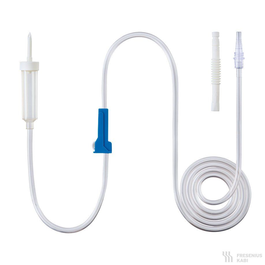 Überleitgerät mit Dorn-Anschluss für das intra- und postoperative Überleiten von Spüllösungen aus Behältnissen mit Stopfenanschluss.