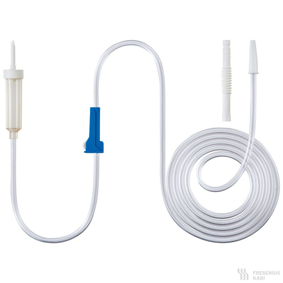Überleitgerät mit Dorn-Anschluss für das intra- und postoperative Überleiten von Spüllösungen aus Behältnissen mit Stopfenanschluss.