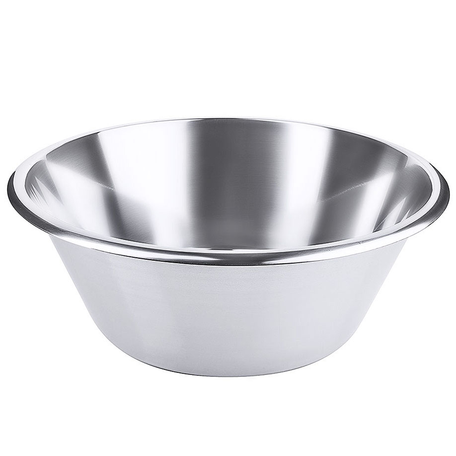 flache konische Form, aus Edelstahl 18/10, seidenmatt poliert, offener, glatter Rand, mittelschwere Qualität, Ø-Boden 28,5 cm, Höhe 15,5 cm
