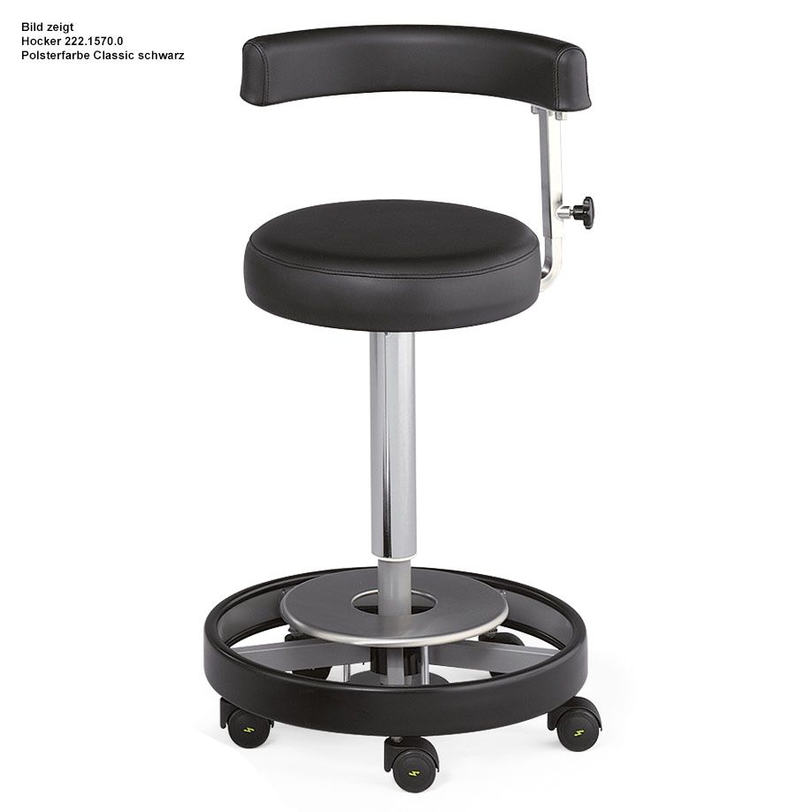 Spezialpolstersitz 8 cm mit Kunstlederbezug, Gasfederhöhenverstellung von 49 bis 69 cm, mit Fußringauslösung, Rückenlehne mit Kunstleder bezogen, 5-Fußkreuz pulverbeschichtet graualuminium RAL 9007, mit elektrisch leitenden Doppelrollen aus Kunststoff Ø 50 mm, für glatte/harte Böden, umlaufender schwarzer Stoßschutz, Sitzfläche: Ø 36 cm, sichere Arbeitslast: 135 kg