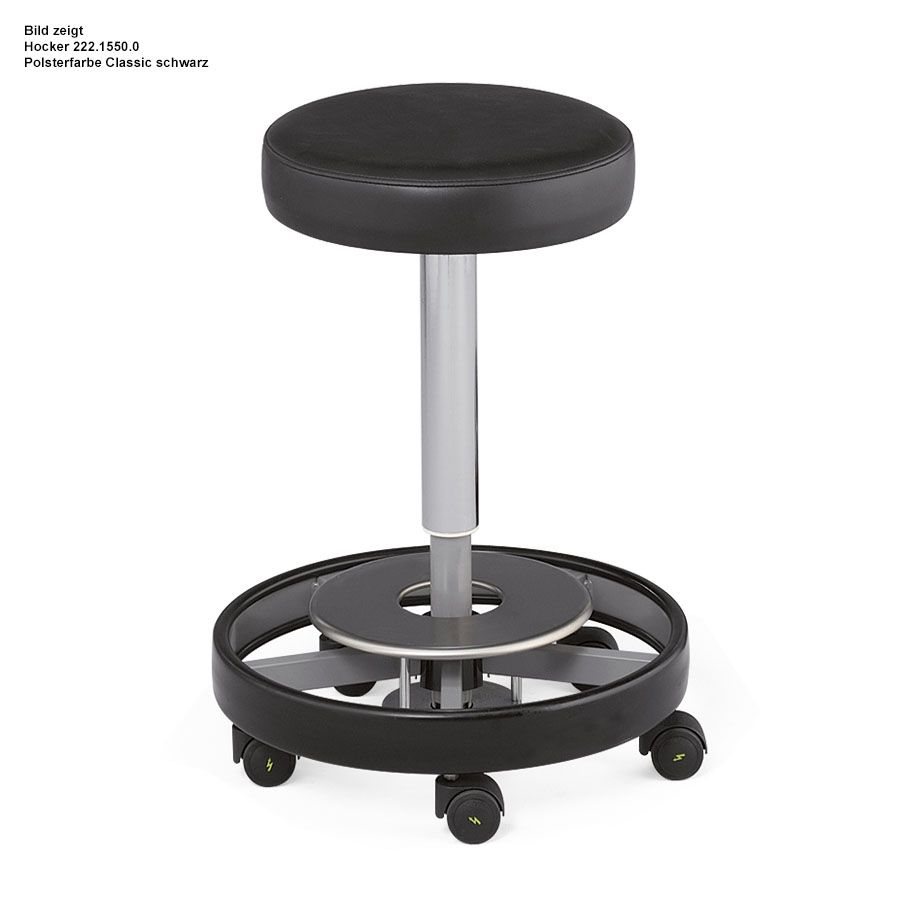 Spezialpolstersitz 8 cm mit Kunstlederbezug, Gasfederhöhenverstellung von 49 bis 69 cm, mit Fußringauslösung, 5-Fußkreuz pulverbeschichtet graualuminium RAL 9007, mit elektrisch leitenden Doppelrollen aus Kunststoff Ø 50 mm, für glatte/harte Böden, umlaufender schwarzer Stoßschutz, Sitzfläche: Ø 36 cm, sichere Arbeitslast: 135 kg