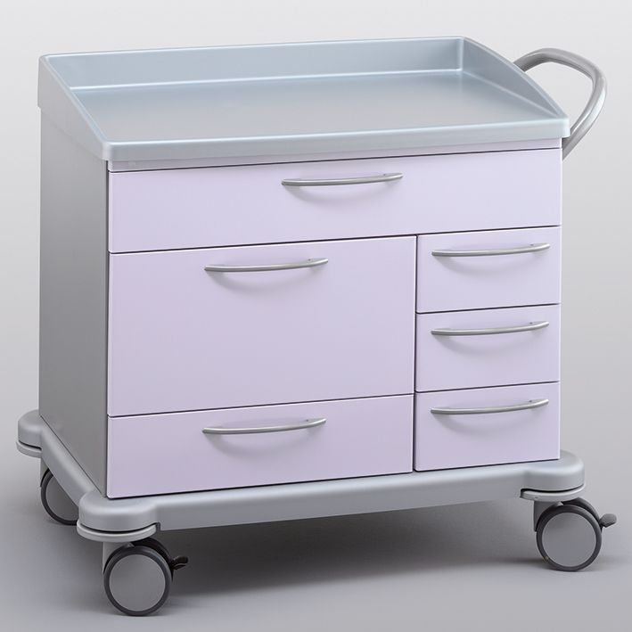 4 geschlossene Doppelrollen Ø 125 mm, aus Kunststoff, kugelgelagert, elektrisch leitend, davon 2 Rollen mit Totalfeststeller und 1 Rolle mit Richtungsfeststeller, Fahrwerksabdeckung silbergrau, Wandabweiser, Arbeitsplatte aus Kunststoff silbergrau, mit Profilrand, Schiebegriff. Maße (B x H): 90 x 86 cm.