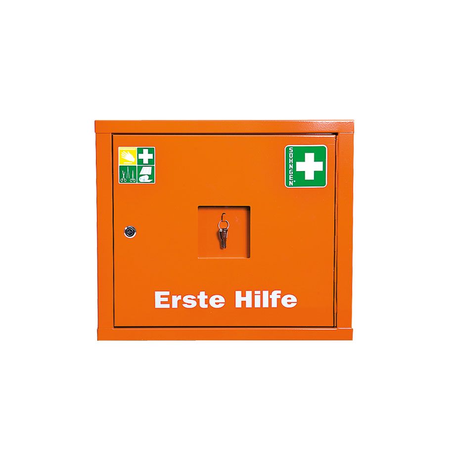 Ca. 490 x 420 x 200 mm, Qualitäts-Feinblech, orange, eintürig, verschließbar, 1 fester Fachboden. Sicherheitsschloss mit 2 Schlüsseln, Notschlüsselfach in der Tür.