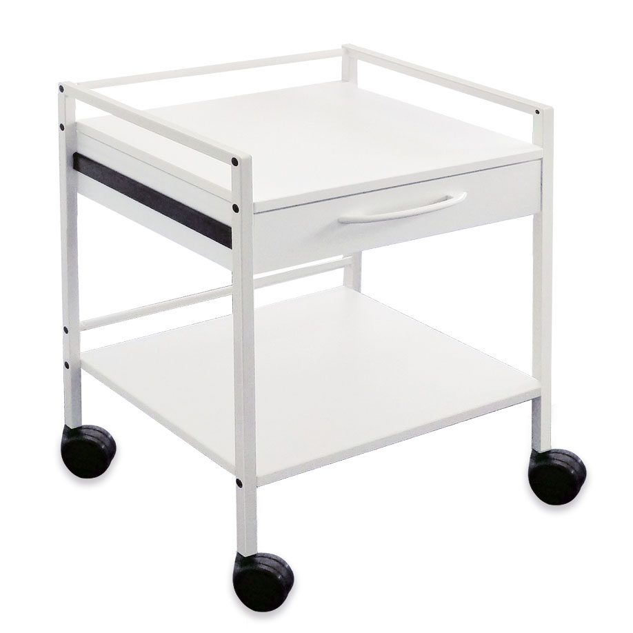 Gestell aus Vierkantrohr, zerlegbar, pulverbeschichtet in grauweiß RAL 9002, Schublade mit vormontierten, kugelgelagerten, schwarz verzinkten Präzisionsschienen, Tischplatte, Boden und Schubladenblende kunststofffurniert, perlweiß 60, Blende mit Bügelgriff, pulverbeschichtet in grauweiß RAL 9002, 4 Doppelrollen Ø 75 mm, montiert, Maße (B x H x T): 58 x 75 x 45 cm. (Arbeitslast gesamt bis 50 kg, Schublade bis 10 kg, Tischplatte / Boden bis 20 kg). Der Vielzweckwagen kann zusätzlich zur vorhandenen Schublade mit maximal 2 Schubladen ausgestattet werden.