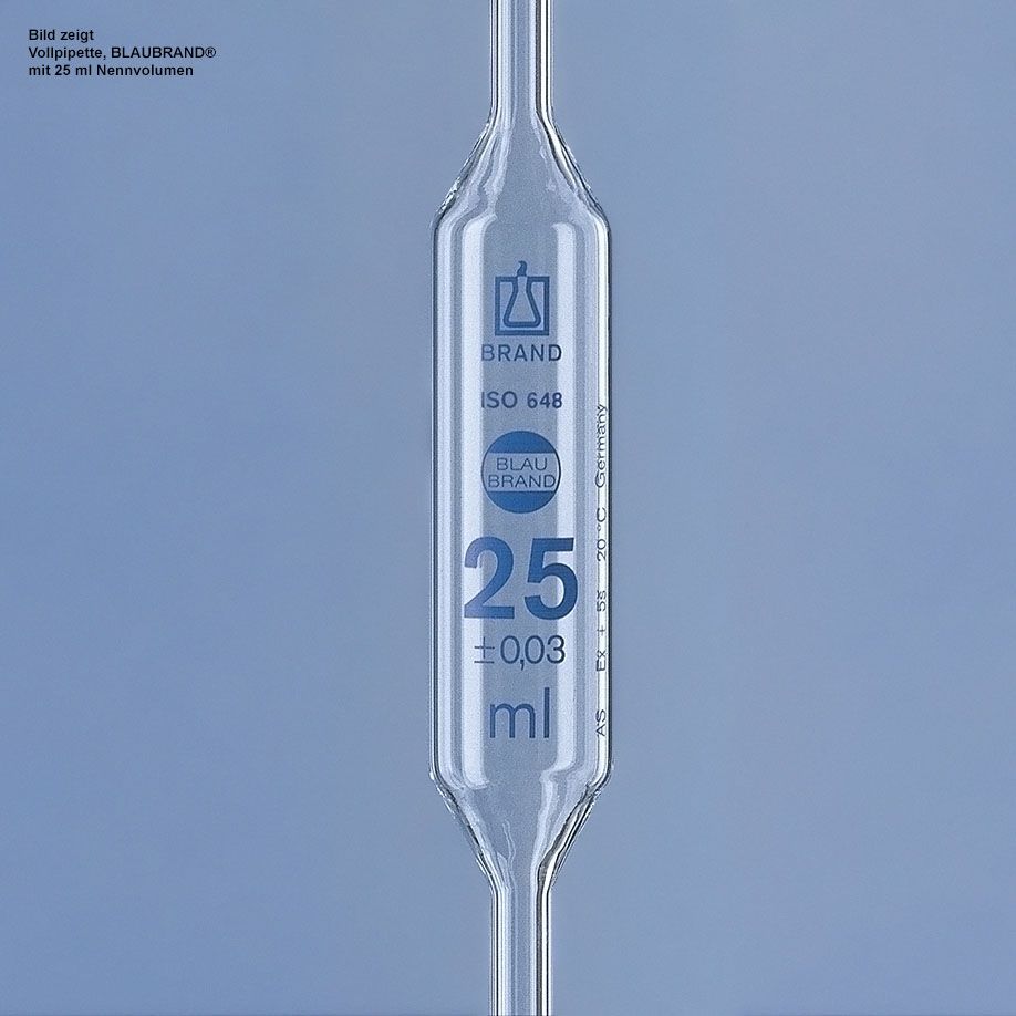 DIN EN ISO 648. Justiert auf Ex". Wartezeit 5 Sekunden. Alle BLAUBRAND® Vollpipetten werden mit Chargennummer und einem beiliegenden Chargenzertifikat pro Originalverpackung geliefert. 330 mm lang."