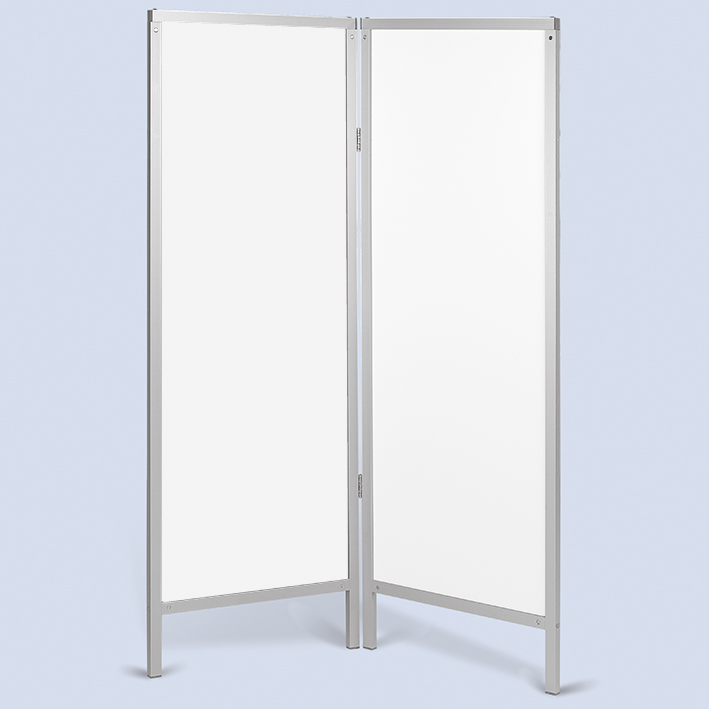 Die Rahmen mit den 3 mm starken, schlagfesten und leicht zu reinigenden PVC-Hartschaumplatten sind durch zwei verzinkte Paraventscharniere verbunden. Eine hohe Standsicherheit bietet der robuste Aluminiumprofilrohrrahmen (Paraventscharniere lassen sich nach zwei Seiten umklappen). Die gleichmäßig, feinzellige Schaumstruktur ist homogen durchgefärbt, schwer entflammbar und desinfektionsmittelbeständig.
