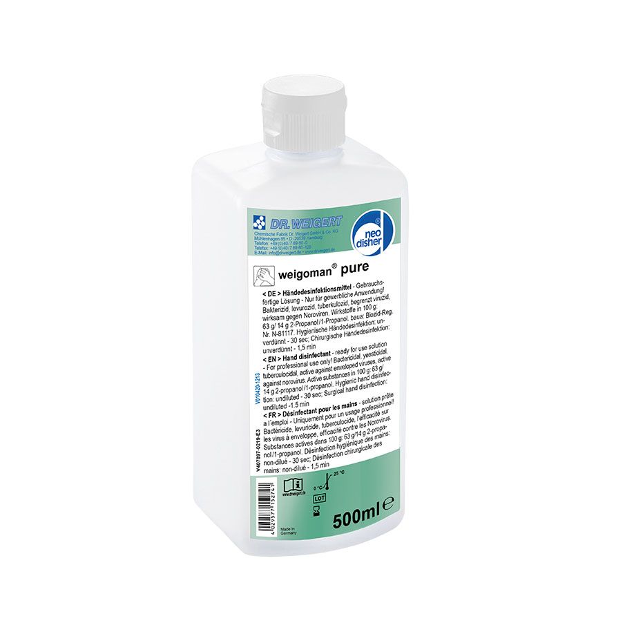 Alkoholisches Händedesinfektionsmittel zur hygienischen und chirurgischen Händedesinfektion für Krankenhäuser und andere Einrichtungen des Gesundheitswesens, Ambulanzen, Arztpraxen, Pflegeheime (einschließlich häuslicher Pflege von Patienten), Krankenhauskantinen, Großküchen, pharmazeutische Industrie, Produktionsstätten, Laboratorien mit hochwirksamen und synergistisch wirkenden Rückfettern für eine verbesserte Hautverträglichkeit. weigoman® pure ist und parfüm- und farbstofffrei und für sensible Haut geeignet. IHO- und VAH-gelistet.