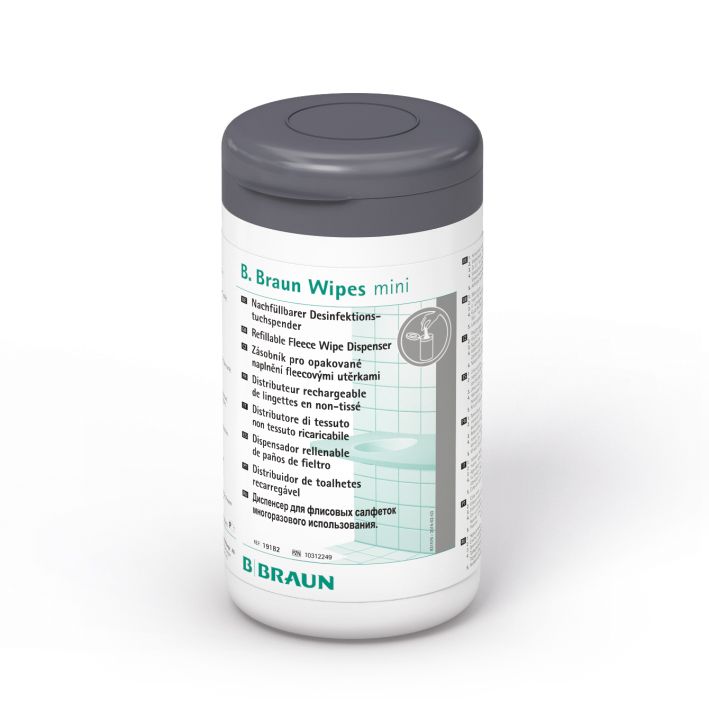 Nachfüllbare Tuchspenderdose zum Befüllen mit ca. 0,7 Liter Tränkflüssigkeit. 4 Wochen Haltbarkeit der angesetzten Gebrauchslösung mit den B. Braun Wipes mini ECO. Geprüfte B. Braun Desinfektionsmittel: Hexaquart® forte,