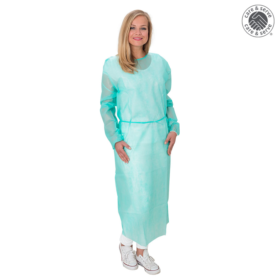 als Vorsichtsmaßnahme zum Schutz vor Kreuzkontaminationen, Polypropylen-Spinnvlies ca. 18 g/m², ca. 140 x 130 cm (B x L), mit solider PE-Laminierung an Armen und Frontpartie, Bänder zum Binden in Nacken und Taille, mit Gummizugbündchen an den Handgelenken