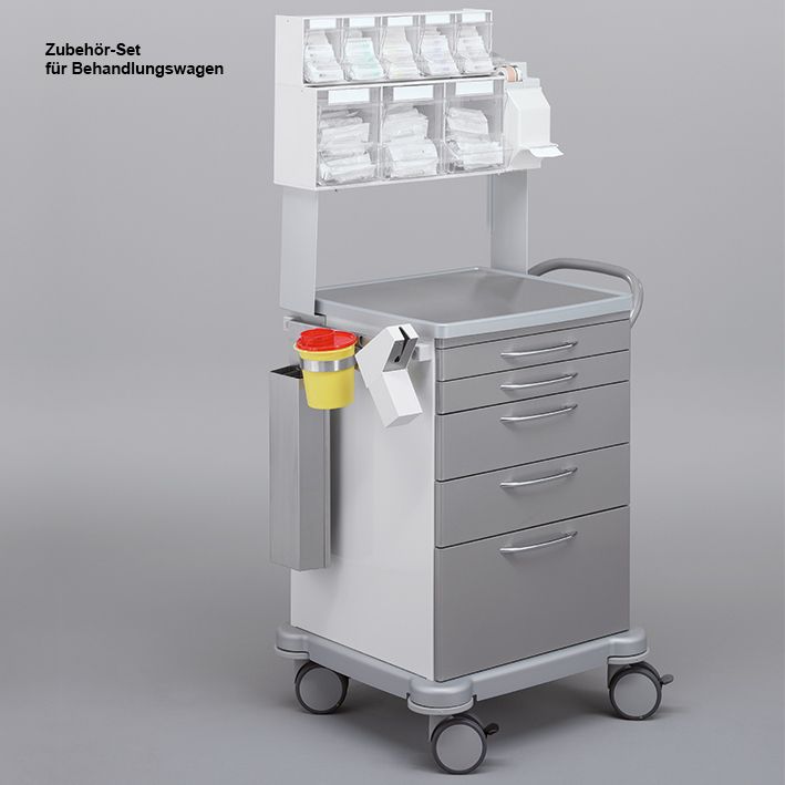 bestehend aus: Injektionsmittelspender Nr. 202.1610.0 mit Konsole Nr. 202.1860.1, Seitenschiene Nr. 202.3000.0 links montiert mit Köcher Nr. 200.1380.0, Medi-Müll-Set Nr. 205.1550.0 und Ampullenöffner Nr. 202.4310.0, für Funktionswagen 600 mm breit.