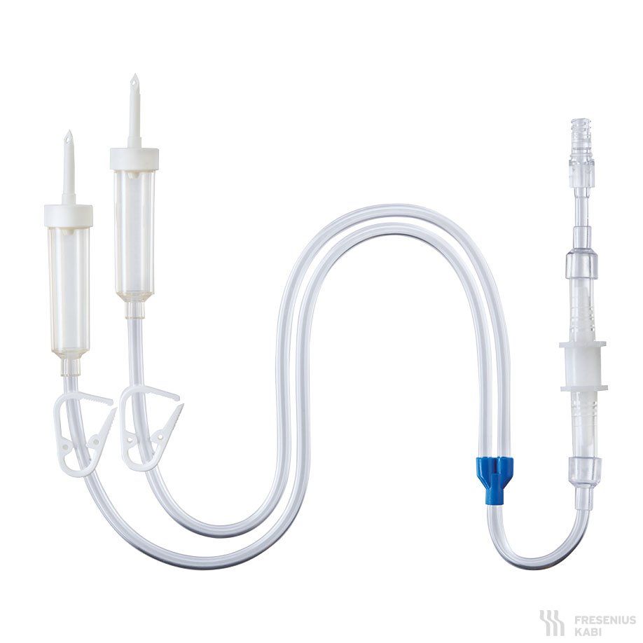Überleitgerät mit Dorn-Anschluss für das intra- und postoperative Überleiten von Spüllösungen aus Behältnissen mit Stopfenanschluss.